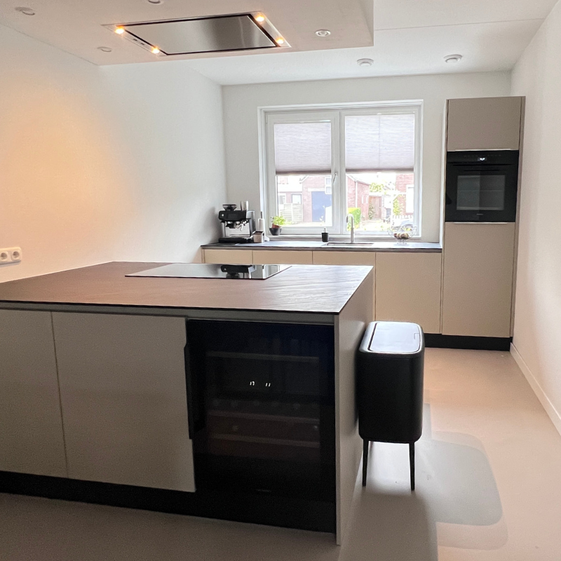In Dalfsen heb ik een prachtig project uitgevoerd waarbij een relatief nieuwe keuken — slechts drie jaar oud — volledig werd getransformeerd naar de stijl die de nieuwe bewoners voor ogen hadden. Hoewel de keuken technisch in perfecte staat was, paste de oorspronkelijke witte kleur niet bij hun smaak en het interieur van het huis. Om de ruimte een warmere en modernere uitstraling te geven, kozen zij voor een beige/taupe foliekleur.