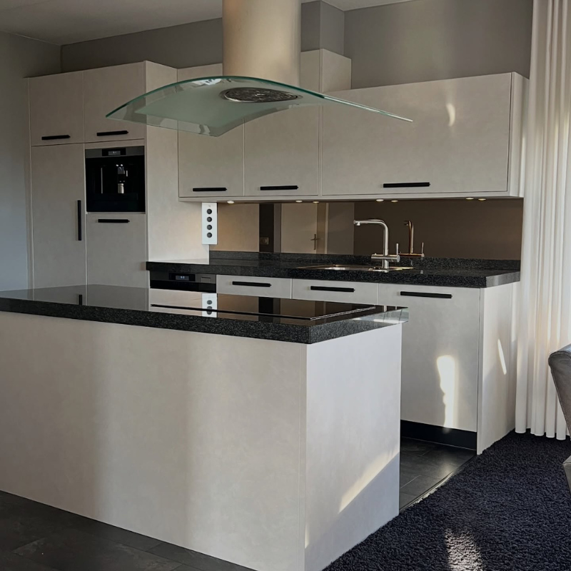 Voor dit project heb ik een keuken van ongeveer twintig jaar oud een volledige metamorfose gegeven. De oorspronkelijke folie van de deurtjes en lades liet hier en daar los aan de randen, waardoor de keuken er op sommige plekken versleten uitzag. Om een strak en duurzaam resultaat te garanderen, heb ik eerst alle oude folielagen zorgvuldig verwijderd met behulp van een föhn.